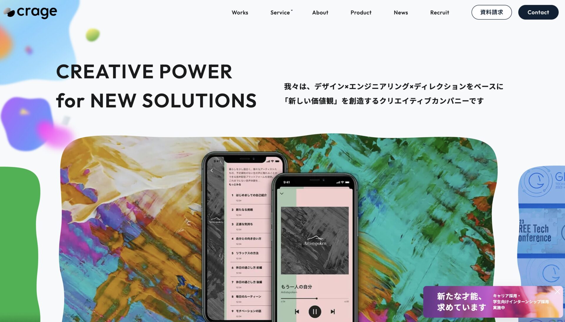 crage株式会社は、ブランディングとWeb制作を軸に、企業の価値向上を支援するクリエイティブカンパニーです。コーポレートサイト、サービスサイト、ECサイトの企画・制作を中心に、UI/UX設計やビジュアルデザイン、フロントエンド開発まで一貫して対応しています。