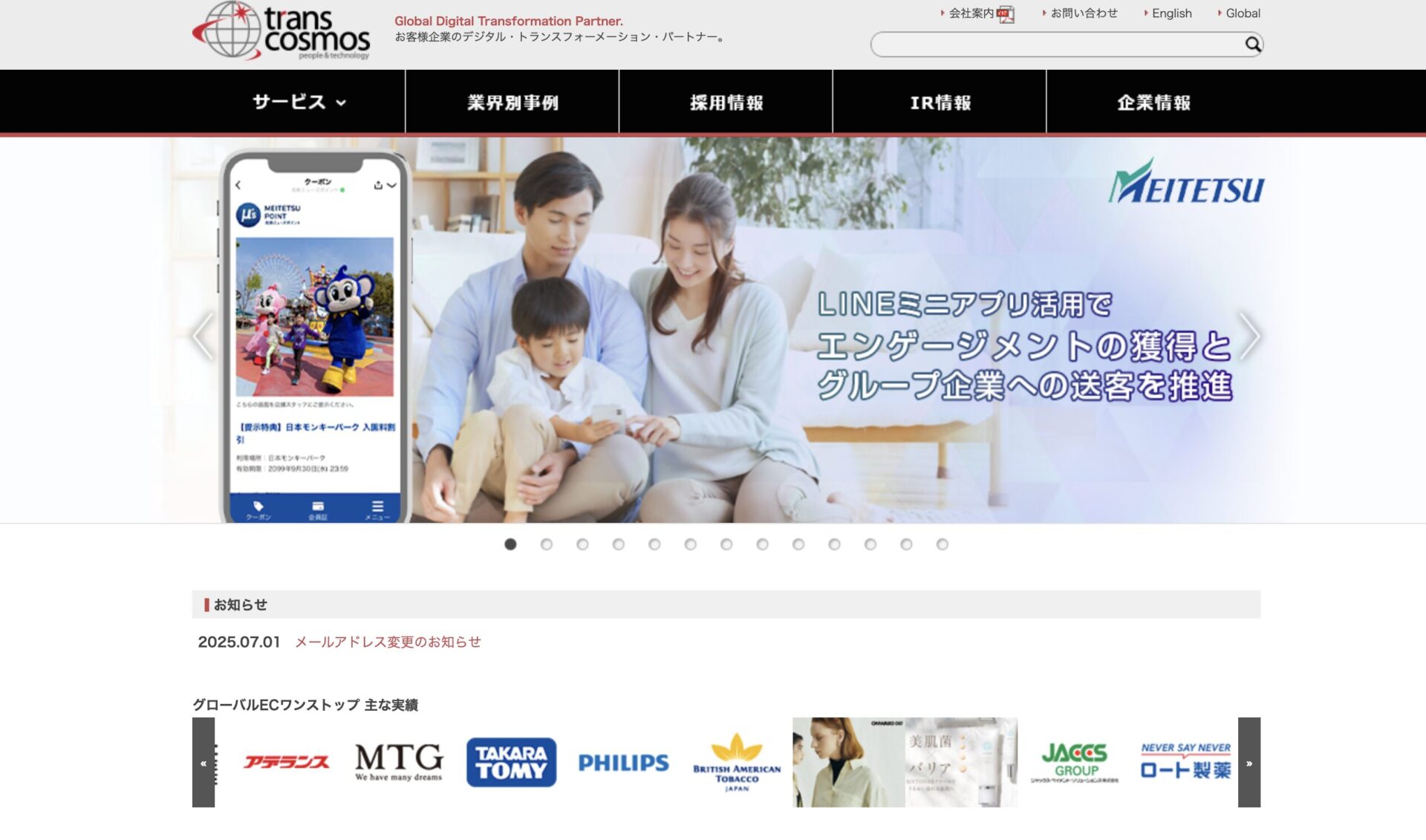 トランス・コスモスは、デジタルマーケティング、EC支援、コンタクトセンター運営を強みとする総合マーケティング支援企業です。広告運用からWeb制作、CRM、データ活用までを一貫して提供し、企業のDX推進を支援しています。