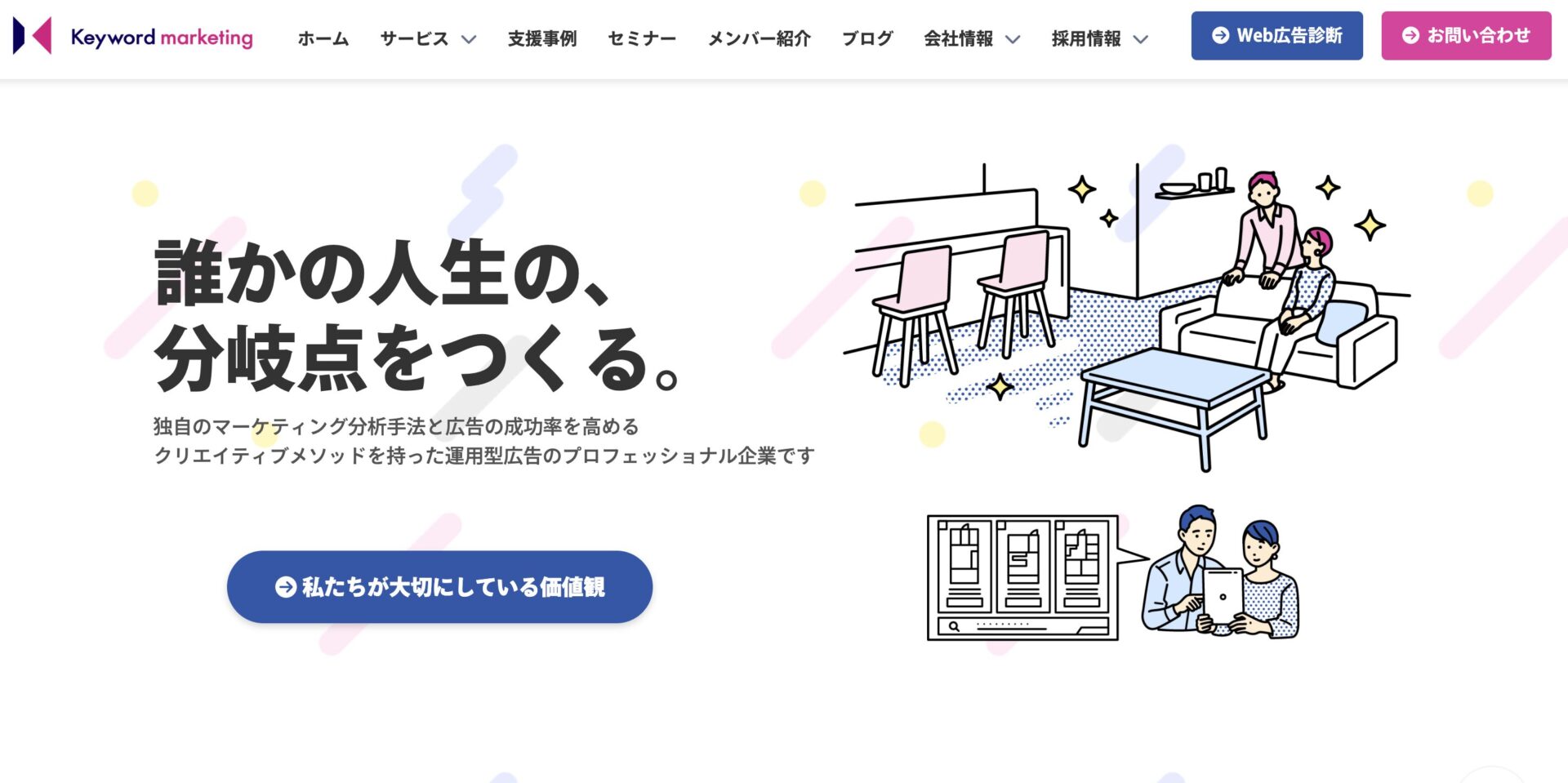 株式会社キーワードマーケティングは、リスティング広告を中心とした運用型広告に特化した広告代理店です。検索ユーザーの意図を重視したキーワード設計と広告文改善を強みとし、成果重視の広告運用を行っています。