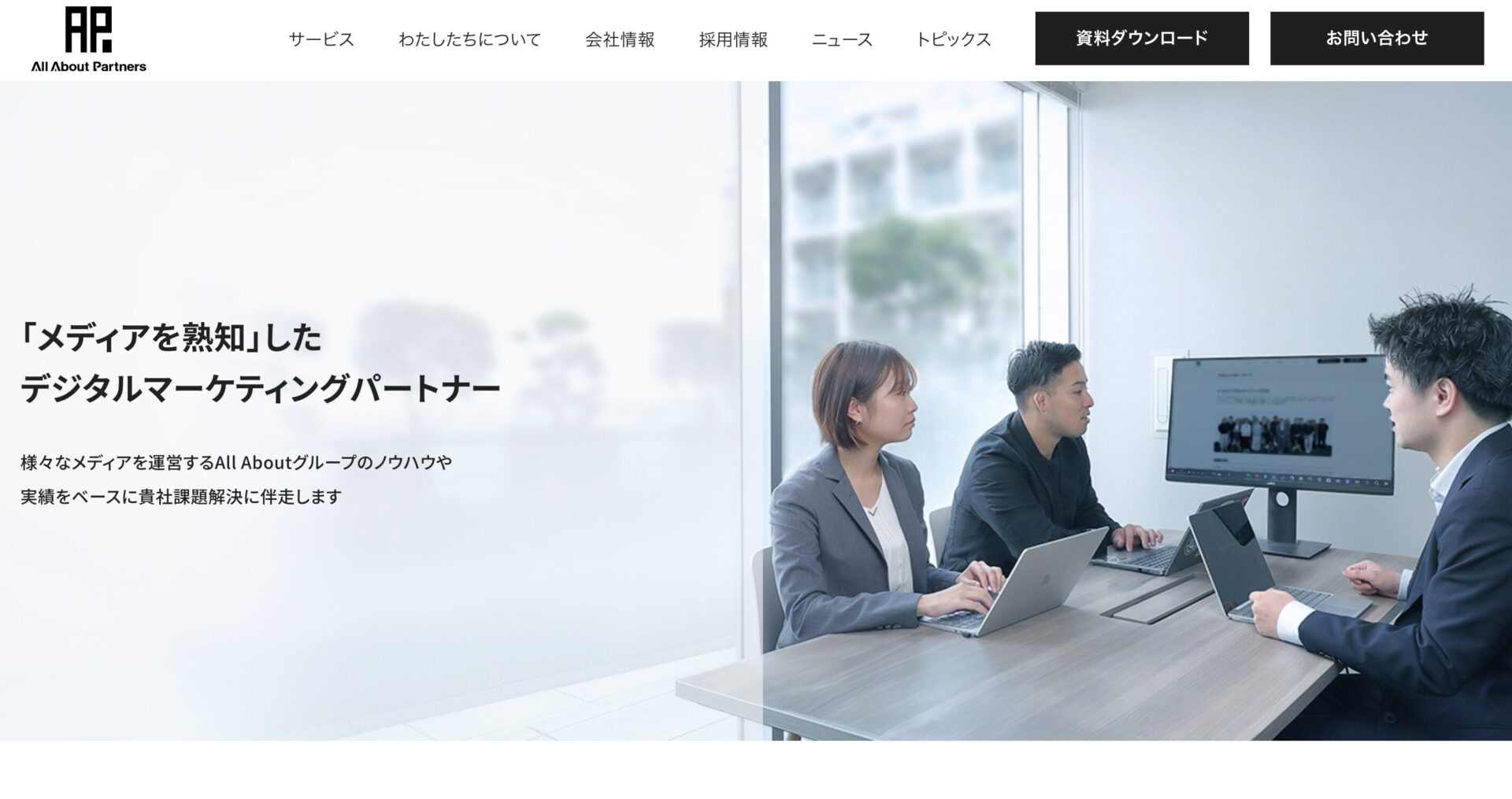 株式会社オールアバウトパートナーズは、専門家ネットワークを活用したコンテンツマーケティングと広告支援を行う企業です。All Aboutグループの知見を活かし、記事広告やタイアップ、SNS・動画施策などを通じて信頼性の高い情報発信を実現しています。